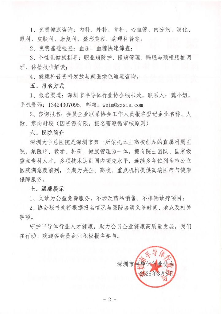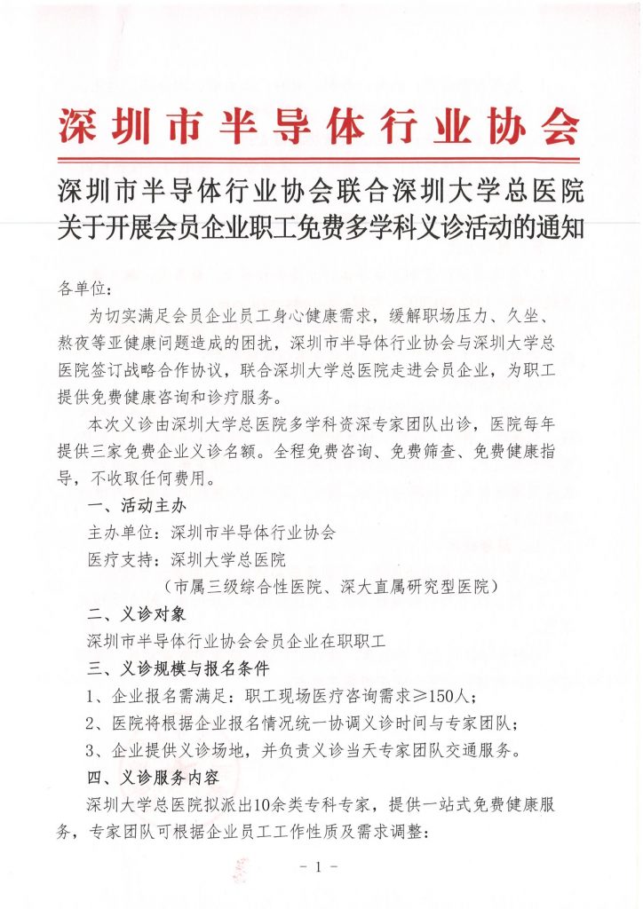 深圳市半导体行业协会联合深圳大学总医院关于开展会员企业职工免费多学科义诊活动的通知