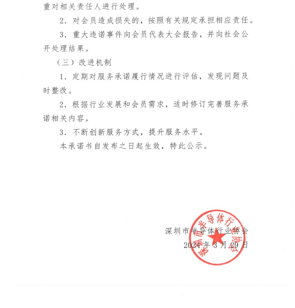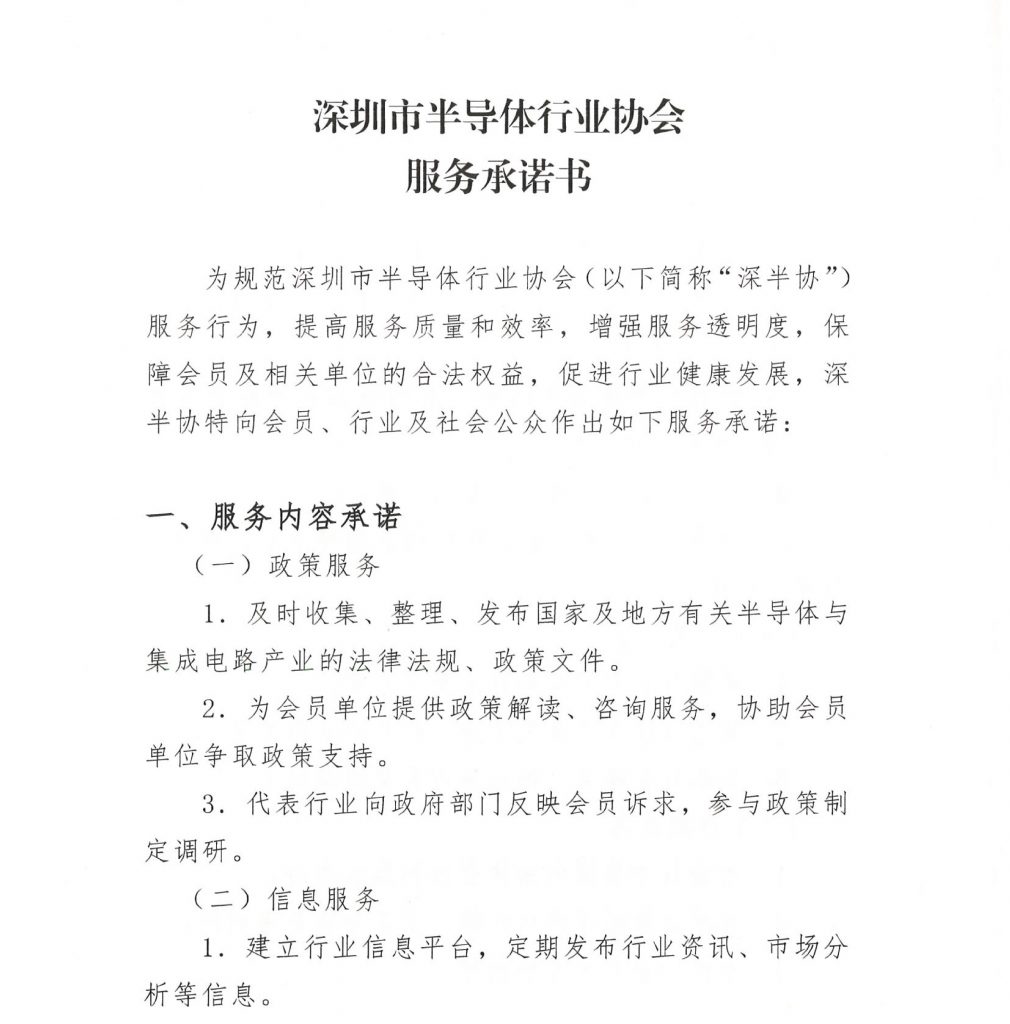 为进一步规范协会服务流程、提升服务质量和效能,深圳市半导体行业协会结合当前半导体产业发展需求及会员单位的实际服务诉求,现正式发布《深圳市半导体行业协会服务承诺书》。请各会员单位查阅承诺书全文,并在日常服务对接过程中,对承诺书的履行情况进行监督。若有服务建议或反馈,可通过会员服务部服务热线与我们沟通。衷心感谢您的支持与配合!